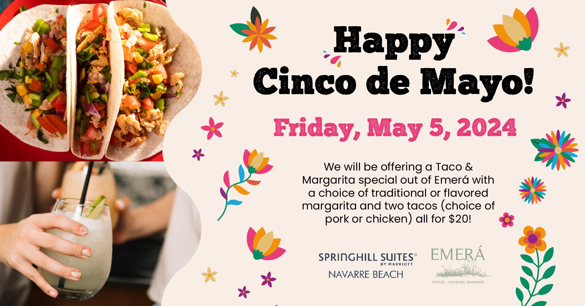 We will be offering a Taco & Margarita special out of Emerá – choice of traditional or flavored margarita and two tacos (choice of pork or chicken) all for $20!